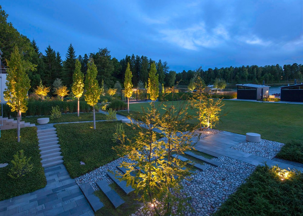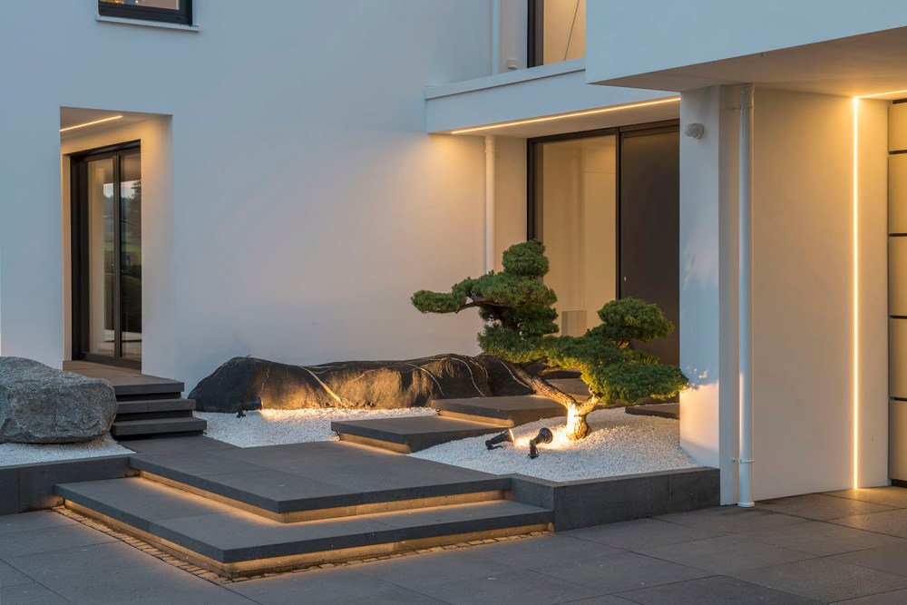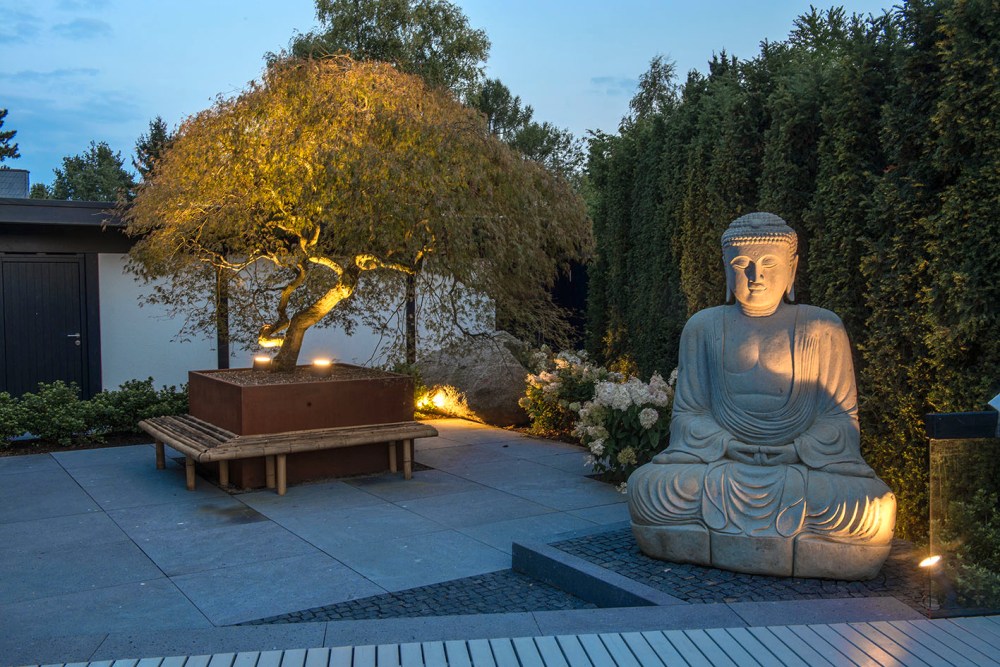 Was für eine großartige Wandlung. Wenn die natürliche Helligkeit langsam in Dämmerung übergeht, kann ein Garten eine faszinierende, anheimelnde Atmosphäre ausstrahlen – vorausgesetzt, es wurde eine Außenbeleuchtung installiert. Diese Stimmung empfinde ich sowohl in den Wintermonaten, wenn die Dauer der Dunkelheit kein Ende zu nehmen scheint, als auch während der wärmeren Saison als sehr wohltuend. In diesen Momenten erhält draußen alles eine neue Bedeutung: Wege, Brunnen, die Spiegelung der Wasseroberfläche, die Vegetation, der einzeln stehende Baum. Details, die am Tage unbeachtet bleiben, werden durch Licht zu einem Blickfang. Die Illuminierung des Gartens hat einen zweifachen Effekt. Einerseits erhöht sie ganz praktisch die Sicherheit, andererseits verleiht sie der Gestaltung ungeahnte Impulse. Es ist empfehlenswert, das Licht auf mehrere Quellen wie Strahler zu verteilen, damit ein attraktives Wechselspiel von Hell auf Dunkel entstehen kann und vielleicht sogar Illusionen beflügelt werden. So lassen sich – je nach Jahreszeit – wichtige Aspekte von der Terrasse oder den Wohnräumen in spannende Gartenbilder umsetzen. Licht im Garten ist eine wichtige Investition und wenn LED-Strahler eingesetzt werden, bleiben die Stromkosten überschaubar. Titelbild: Gartendesign Christian Bahl, Foto: Jürgen Becker