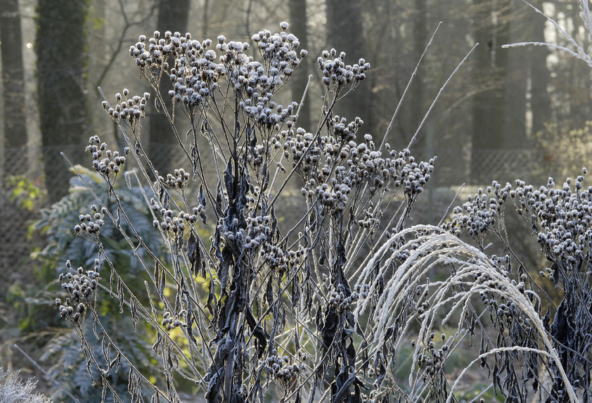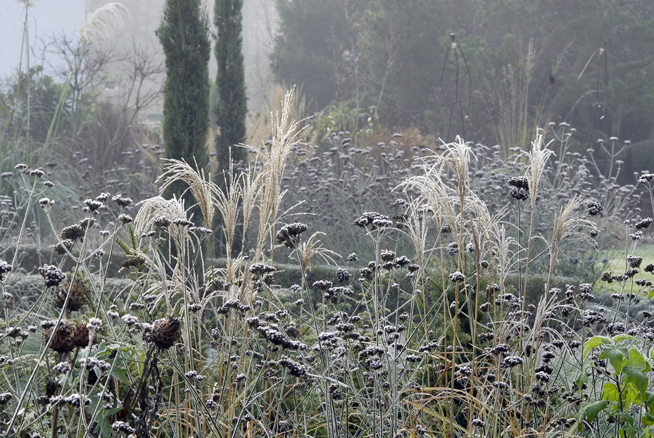 Miscanthus sinensis ‚Rotsilber‘ im Raureif. Foto: Jürgen Becker; Design: Peter Janke
