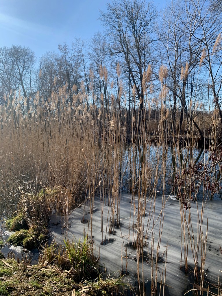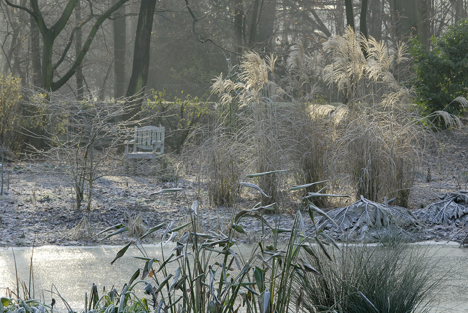 Während einer Wanderung in der brandenburgischen Havellandschaft hat mich die winterliche Stimmung geradezu beglückt. War es das überraschende Moment, das Naturhafte, das sanfte Licht, die Spiegelung des weiten Himmels auf dem See oder die Flora in ihrer Vielfalt, die mich so einnahm? Wahrscheinlich war es die Kombination von allem, die mich genauer hinschauen ließ. Die Frage, die sich mir stellte: Lässt sich solch eine Atmosphäre auch in einem Garten realisieren? Warum eigentlich nicht, wenn das Grundstück ein größeres Gewässer zulassen würde. Die Pflanzenauswahl wird einfach den anderen Verhältnissen angepasst. Das heimische Schilfrohr (Phragmites) das an vielen Seen ein markanter Begleiter ist, kommt für die Platzierung in einem Garten nicht in Frage, weil es zu stark wuchert und benachbarte Gewächse verdrängen würde. Alternativen bietet die Gattung des Chinaschilfs (Miscanthus), das mit interessanten Arten und Sorten aufwartet. Sie alle bevorzugen nicht die feuchte Sumpfzone, sondern einen trockenen Standort. Ähnlich verhält es sich mit dem Rohrkolben (Typha angustifolia), der für die Pflanzung im Garten kaum in Frage kommt, weil auch er sehr dominant ist. Dagegen ist der Kleine Rohrkolben (Typha minima) besser geeignet, allerdings ist sein Wuchs nicht so elegant. Die Uferzone könnte mit Sumpfschwertlilien (Iris pseudacorus) in den Blick gerückt werden. Kleinwüchsige Weiden wie Salix rosmarinifolia oder Hartriegel wegen der leuchtend roten Rinde (Cornus alba sibirica; Cornus sanguinea ‘Winter Beauty’ gehören ebenfalls zu einer schönen Kulisse. Eine Bereicherung auf einem trockenen Standort wären beispielsweise auch – jeweils in größeren Gruppen – Bandkraut (Phlomistuberosa), Blutweiderich (Lythrumsalicaria, Mädesüß (Filipendulaumaria) und unkomplizierte Taglilien (Hemerocallis). So wird bald ein schönes Bild entstehen, dass im Sommer die Blicke auf sich ziehen wird, aber mit Sicherheit auch in den Wintermonaten